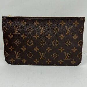 This is a beautiful Louis Vuitton Monogram Beige Neverfull MM Zip Pouch Wristlet. Excellent pre owned condition. There’s a very minor crack that has been both resealed and sticked. Hardly noticeable if at all. No odors. No stains. Very clean interior with interior slip in compartment with authenticity tabs both in the interior of the wall pocket and an additional authentication tab in the main compartment. 9.75” x 5.75. Minor water spots on the wristlet.