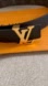 Elegant belt featuring Louis Vuitton's signature monogram. Black and brown design with a striking gold buckle.