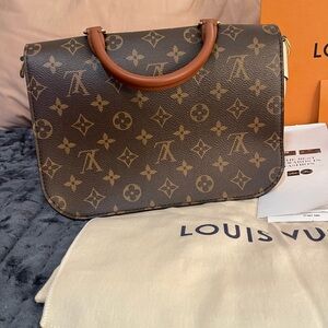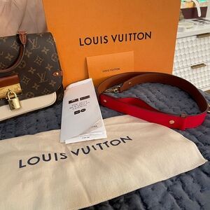 This Louis Vuitton satchel features the iconic monogram canvas in a classic brown, accented by a striking red leather detail. Its structured design is enhanced by a gold-toned clasp, offering both elegance and functionality. A perfect choice for those who value luxury and timeless style.