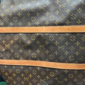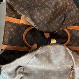 The perfect carry-on Keepall duffle bag rendered in the house's iconic Monogram coated canvas, featuring Vachetta leather trim and accented with gold-tone brass hardware. Great condition. No stains on the the inside like new. Minor water mark on bottom leather. Date/Authenticity Code: SPO925