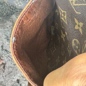 Pre-loved vintage condition with visible signs of wear: leather has developed patina and watermarks, minor scuffing and darkening on leather trim and corners, and general age-related wear. Please refer to all photos for an accurate depiction of condition — priced to reflect vintage nature and use.