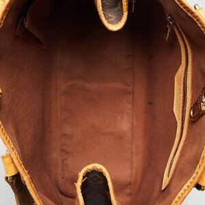The exterior coated canvas has rubbing and wear to the bottom corners. The leather trim has rubbing, wear and soiling throughout. The piping at the corners has darkened and shows rubbing and wear. The handles have softened, have rubbing and the glazing shows wear throughout. The hardware is bright with scuffing and some tarnishing. The interior lining has soiling, stains, rubbing and wear throughout.