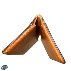 This vintage Louis Vuitton bifold wallet features the iconic Monogram canvas exterior and a warm brown leather interior. Compact and sleek, it includes one exterior slip pocket and an interior designed to hold a few essential cards. Perfect for light everyday use or as a collector’s item, this piece blends timeless LV style with practicality.