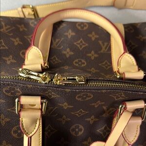Elegant Louis Vuitton duffel bag. Features iconic monogram canvas. Includes leather handles and strap. Perfect for travel or daily use.