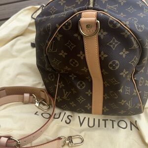Stylish duffel bag with iconic monogram canvas. Features tan leather handles and detachable strap.