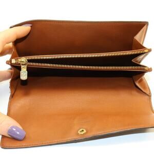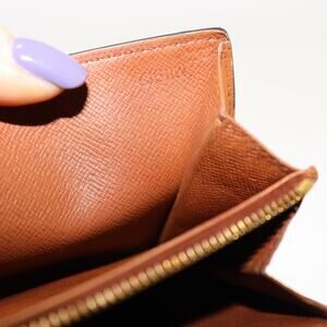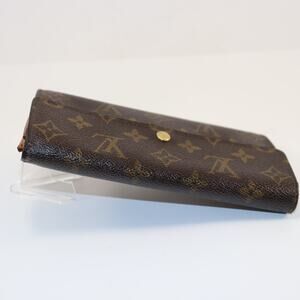 Authentic Louis Vuitton monogram canvas French purse wallet. Crafted in LV’s signature monogram coated canvas with brown leather interior. Features a snap button closure, multiple card slots, bill compartments, and a zippered coin pocket with gold-tone LV pull.