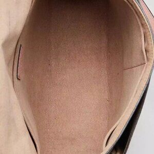 The exterior coated canvas is clean with rubbing to the bottom corners. The edges of the flap are curling and there is a an area of rubbing by the flip lock. The top handle has soiling and scratches. The shoulder strap is clean with light creasing. The hardware has fading and scratches but remains bright. The interior lining has rubbing, creasing, and a noticeable musty scent.