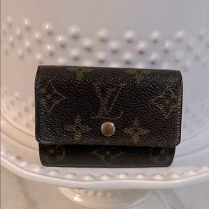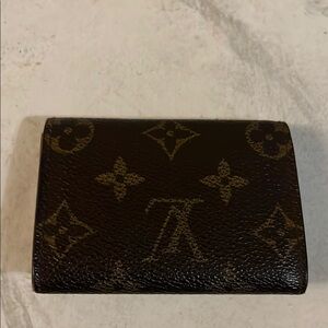 Chic card holder with signature monogram. Dark brown with gold-tone button.
