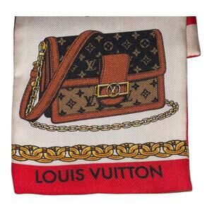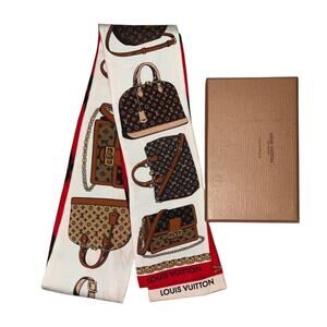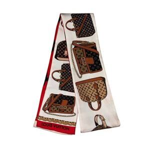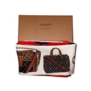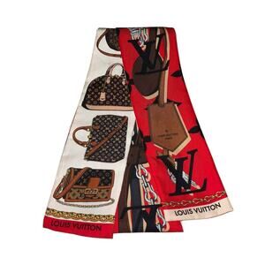 A versatile silk scarf featuring iconic Louis Vuitton motifs.
