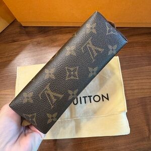 Elegant Louis Vuitton cosmetic pouch with iconic monogram design. Features a classic brown color. Currently sold on the Louis Vuitton store for $590. As he can tell, I have loved this, but I have kept the stains to a minimal and there is light cracking on the inside pouch. Some tarnishes on the zipper handle we are moving and I’m having to get rid of lots of luxury items before the first week of July. This will make a great gift.