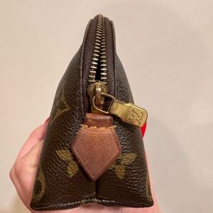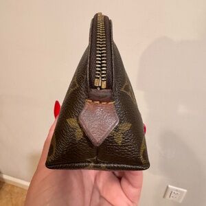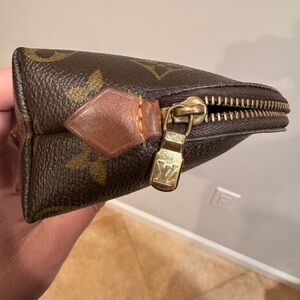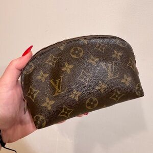 Elegant Louis Vuitton monogram cosmetic pouch. Features classic brown and gold design.