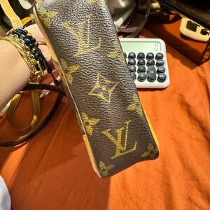 Stylish Louis Vuitton crossbody bag with iconic monogram pattern. Features brown and tan colors. With peeling on outside pouch