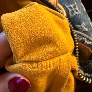 Authentic Louis Vuitton blue monogram denim exterior with beige vachetta leather trim, suede lining, and gold-tone hardware.