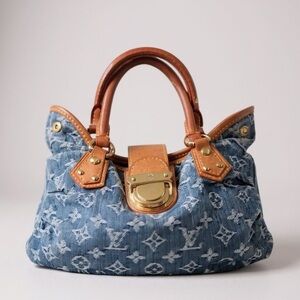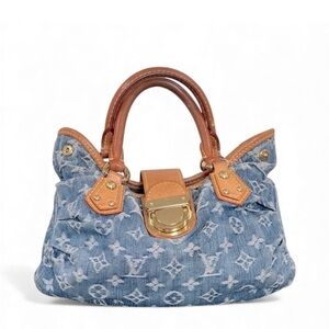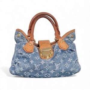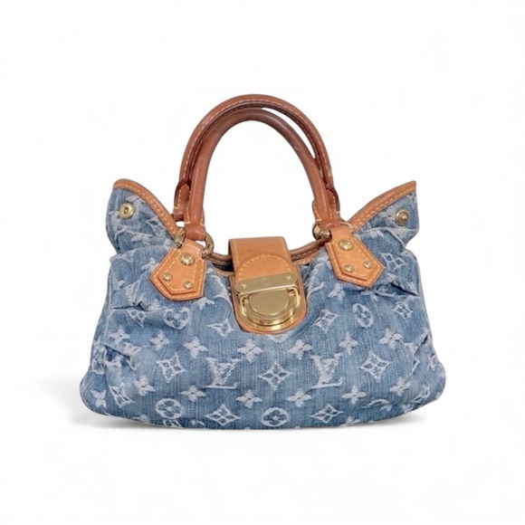 Authentic Louis Vuitton Monogram Denim Pleaty Bag in classic blue denim with natural vachetta leather trim. This rare and timeless Louis Vuitton piece blends casual luxury with everyday functionality. It features rolled top handles, brass hardware, and a front push-lock closure for that signature LV charm.