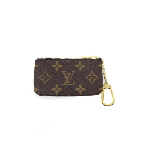 Brand new brown and tan monogram coated canvas Louis Vuitton key pouch with brass hardware, brown Taiga leather lining and zip closure at top. Includes box and dust bag. Visit the website in our bio to learn more.