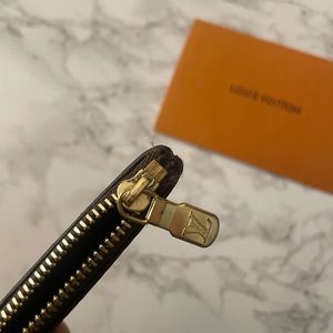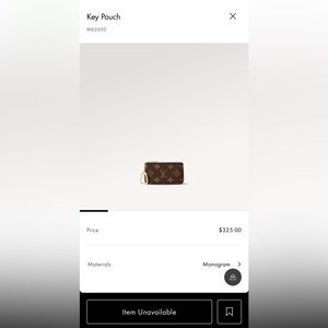 This Louis Vuitton monogram key pouch is sold out in stores. The classic brown pattern with gold hardware is an LV classic.