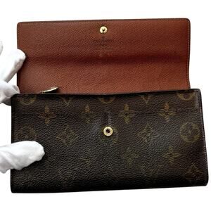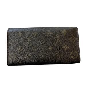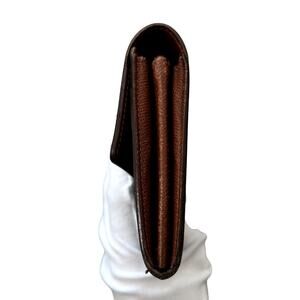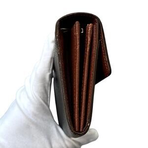 Description: Envelope style design, central zipped coin pouch, two large interior compartments with several card slots, leather with coated canvas, gold hardware, press stud closure, can be worn as a crossbody by adding a chain, comes with custom dust bag, made in France