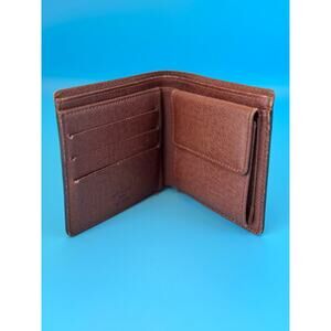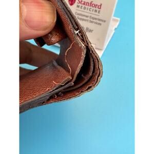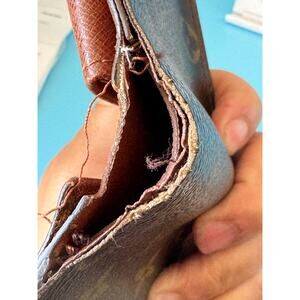 Exterior: Wear at resin glazing, de threading of the seams at the bottom fold of wallet.