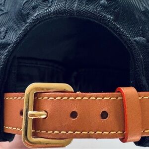 Authentic LV - black cap with mesh logo detail and tan leather adjustable back strap.