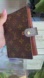 Stylish wallet with iconic monogram pattern. Features brown leather with gold accents.