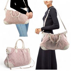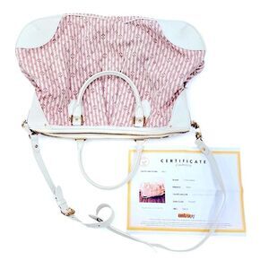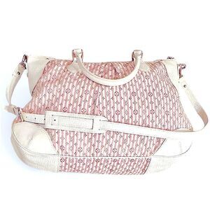 Features: Pink and ivory Louis Vuitton monogram, mini lin cotton and linen blend canvas, ivory colored leather rolled top handles and trim, pleated detailing, detachable adjustable shoulder strap, and gold toned polished brass hardware. Top zip closure, lined with an ivory/ grayish colored fabric interior with 2 small interior open pockets.