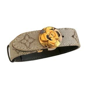 Louis Vuitton LV monogram good luck bracelet. Canvas with LV symbols on outside. Goldplate hardware. 2 holes to allow size adjustment. Beige/brown canvas.