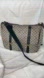 Blue cotton lining, leather trimmings, and adjustable shoulder strap. Several outside and inside pockets. Opens up flat but missing the snap-in diaper changing pad.