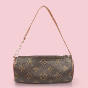 Louis Vuitton Monogram Mini Papillon. The charming pochette is the smaller version of the popular Papillon handbag and is crafted of classic Louis Vuitton monogram on toile canvas. The pochette has vachetta leather piping and a matching strap with a brass clasp end, which can be secured to your handbag. The top zips open to a terra cotta cross-grain leather interior.