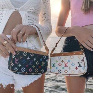 This is an authentic LOUIS VUITTON Monogram Multicolor Pochette Accessories in Black. This chic purse is crafted of Louis Vuitton monogram in 33 colors on black coated canvas. The pouch features vachetta cowhide leather trim and removable strap with polished brass studs. The top zipper opens to a beige microfiber interior. A lovely Y2K style mini bag pochette for an everyday carry!