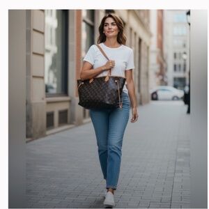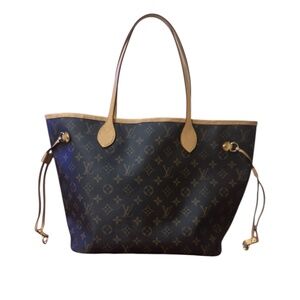 Authentic Louis Vuitton brown coated canvas monogram Neverfull MM tote bag. This is preowned and have had vechetta leather replaced with non original vechetta leather to handles, side cinches, and top trim replaced. Bag looks great like new with replacement. As a used item there are signs of wear, including minimal rubbing, scuffing, changes to gold tone hardware. The interior flaws include removal of clear coating to inner pocket, dirt and marks to lining. Approximate size Length: 12.6inches (32cm) x Height 11.4 inch (29cm) x Width 6.7inch (17cm). Handle drop about 8 inches. First 2 photos for reference only, all other is of actual bag.Please see photos for details.