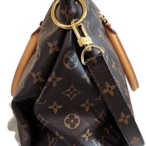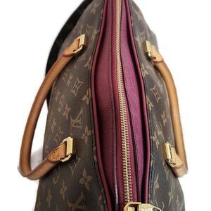 This beautiful, classic Louis Vuitton tote is crafted in Louis Vuitton Monogram Coated canvas. The sides are pleated and the top has a crop-up berry purple accent. The rolled vachetta cowhide top handles have a 4 in drop. The adjustable strap has a 13.25 in drop. Brass hardware and berry purple microfiber interior with pockets. Includes an Entrupy Certification and original dust cover.