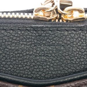 Monogram canvas, black leather accents, zip closure, removable strap
