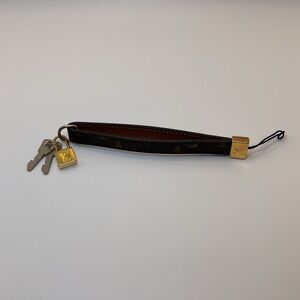 Sophisticated key/phone/bag charm/wristlet by Louis Vuitton. Features iconic monogram design. Gold accents with LV logo. Faux lock charm. About 6” long. Slight wear to hardware otherwise appears unused. Rare find!