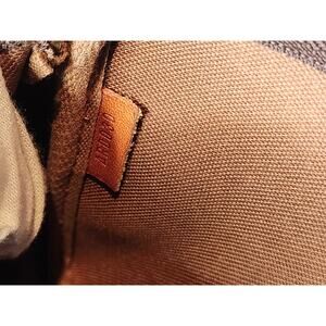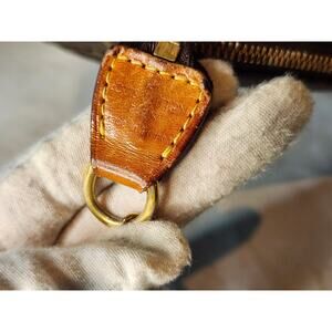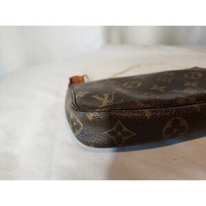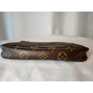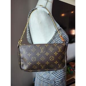 Classic monogram coated canvas pochette with gold-tone zipper and chain strap. Features a structured silhouette, brown textile lining, and top zip closure. Chain strap is a replacement (unbranded)