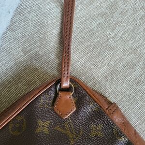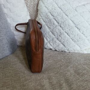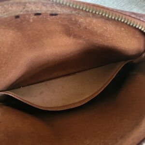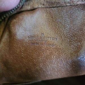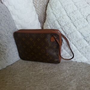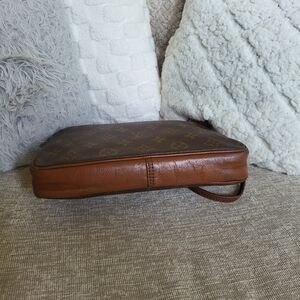 Nice vintage wristlet bag,, canvas Monogram in great condition, some fading on leather outside, inside is good normal wear, some ink dots stains inside, overall in good shape...zipper works very good..good collection piece!!!. Elevate your style with this Louis Vuitton men's bag. Featuring a classic brown monogram design, it's perfect for any occasion. Durable and stylish, this bag is a must-have accessory.
