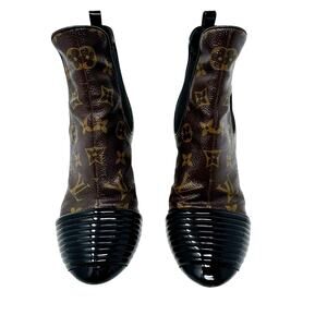 Keywords: Louis Vuitton Revival Boots, Monogram Canvas Ankle Booties, Block Heel Designer Boots, Vintage LV Shoes, Rare Louis Vuitton Boots
