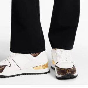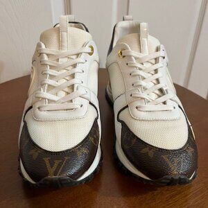 Louis Vuitton - Run Away Sneaker (model 1A4XNL) is a classic running shoe. It has Monogram canvas, and features a gold-tone metal plaque and an LV Circle logo on the side. The wedge-shaped outsole discreetly adds extra height. Great condition. No box or bag.