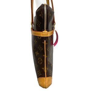 Made in the USA, this ever-so-chic monogram shoulder bag comes with the traditional gold fittings & accents, tan vacchette trim, a front open pocket along, dual leather shoulder straps, a zip top closure, red suede lining that includes 2 open pockets. There is some wear on the bottom corners, otherwise this bag is in good condition. This bag comes with a certificate of authenticity. Serial #SD0044