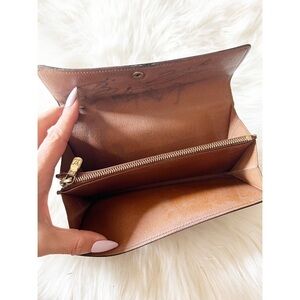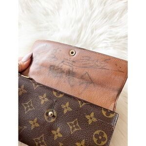 Has writing on the inner flap, minor wear on sides, one corner has cracking. No peeling on inside. Snap works.