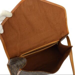 Chic Louis Vuitton satchel with signature monogram. Features tan leather accents and gold-tone buckle. Wear throughout the bag, rubbing, mild cracking, staining and discoloration. Still a very nice bag.