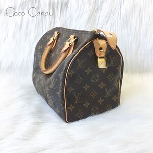 Authentic Louis Vuitton Monogram Speedy 25. Crafted of signature Louis Vuitton monogram coated canvas. This handbag features vachetta cowhide leather top handles & trim with polished gold tone hardware. The top zipper opens to a cocoa brown fabric interior with a hanging zipper pocket. Original dust bag & box included✨