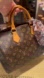 Chic Louis Vuitton satchel with classic monogram pattern. Features a pink scarf accent for a stylish touch.