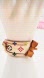 Stylish bracelet featuring a monogram design and a bow accent. Cream base with multicolor details and tan bow.