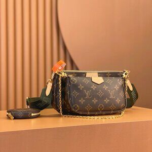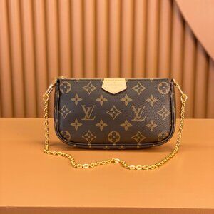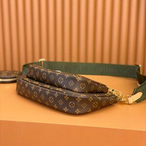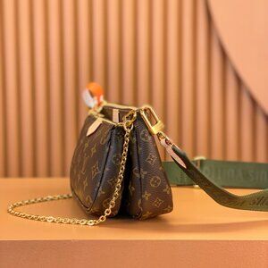 The Louis Vuitton Multi Pochette Accessories is a stylish and versatile handbag designed for women. This crossbody bag features a monogram pattern with a zip closure, a luxurious leather lining, and gold hardware accents. The exterior is crafted from a combination of canvas and leather in a timeless brown color. The bag comes with multiple accessories including a detachable strap, pouch, and original dust bag, making it a practical and chic choice for any outfit.