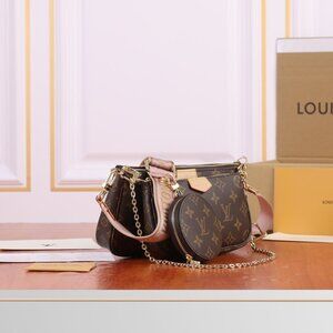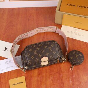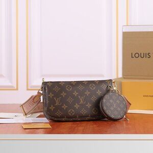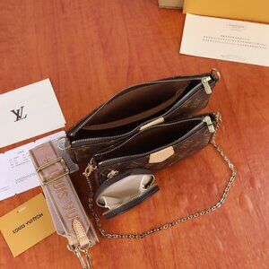 The Louis Vuitton Multi Pochette Accessories is a stylish and versatile handbag designed for women. This crossbody bag features a monogram pattern with a zip closure, a luxurious leather lining, and gold hardware accents. The exterior is crafted from a combination of canvas and leather in a timeless brown color. The bag comes with multiple accessories including a detachable strap, pouch, and original dust bag, making it a practical and chic choice for any outfit.