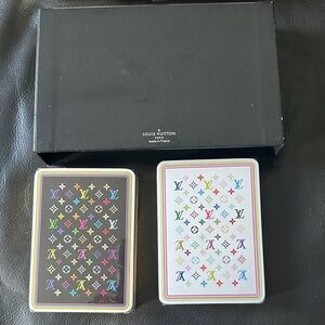 Elegant Louis Vuitton card set with vibrant multicolor monogram. Features two decks in a stylish box. Never been opened!