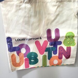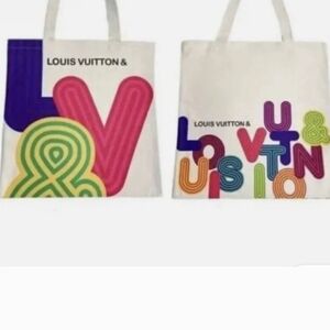 New in the packaging vibrant multicolor graphic tote by Louis Vuitton. Features bold lettering in various colors.