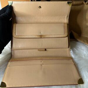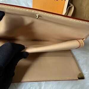 Stylish Louis Vuitton wallet with multicolor monogram. Features brown trim and gold accents. Perfect for any occasion.