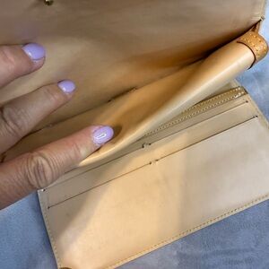 Louis Vuitton Murakami international wallet in white. She’s obviously been loved! Heavy residue in envelope coin compartment. Vachetta has watermarks and rubs. Piping is good. Structurally she’s still good.