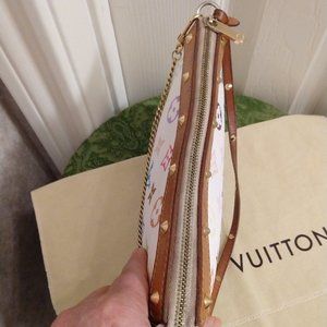 Authentic Louis Vuitton Multicolor Pochette Accessoires in white. Condition is great with light fading of some of the 33 vibrant colors on the canvas, some darkening to leather, scratches to hardware, and some interior staining. The zipper and the claps are intact and work properly. Please examine all photos for details. Comes with dust bag. Gold chain is not included.